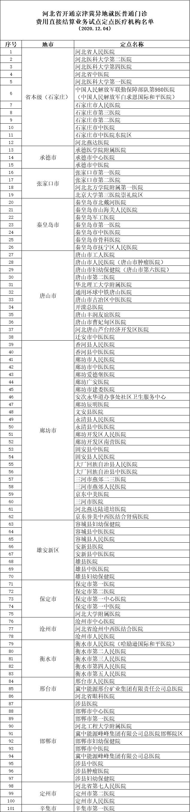 从河北省医疗保障局官网获悉,经省、市两级医疗保险经办机构通过跨省系统联调测试验收,截至11月30日,河北省14个统筹区全部实现上线试运行,并确定将全省101家定点医疗机构纳入京津冀异地就医普通门诊费用直接结算试点定点医疗机构范围。