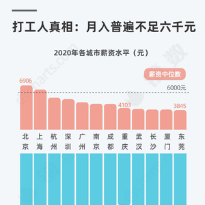 可以看到,2020年仅有北京、上海的工资中位数超过六千元,一线城市如深圳、杭州均未超过六千元。