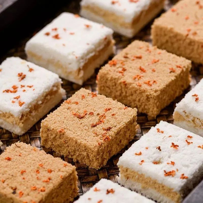 原味,也就是桂花原味,馅料以白芝麻和花生为主。一口下去,米糕的软糯和花生碎的香脆,口感十分丰富!细嚼下,能尝到桂花的淡香。