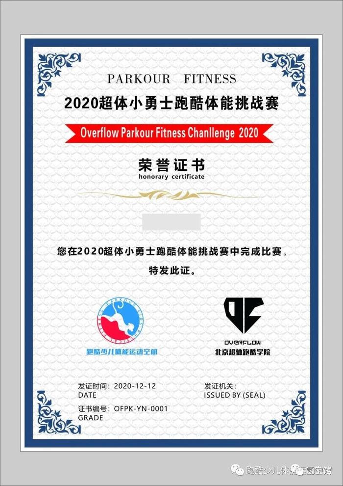 证书由昆明跑酷少儿体能运动空间和北京超体跑酷学院共同监制