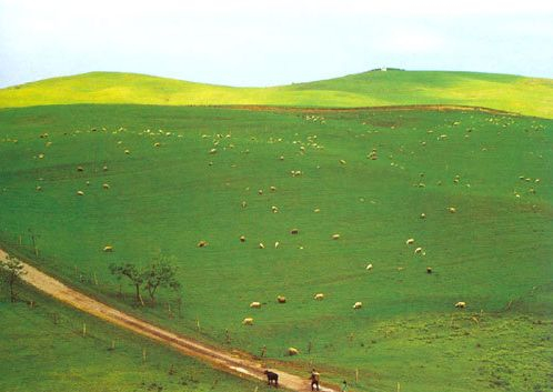 灼甫草场是一片高山草原的名字,她像一个梦一样漂浮在威宁的高原上。接天碧绿的草场就像天上的云一样时展时舒,绿茵茵的沿着起伏的山峦一层一层地铺开,偶尔一片一片的树林点缀其间,牛羊成群,更显几分俊雅和飘逸。