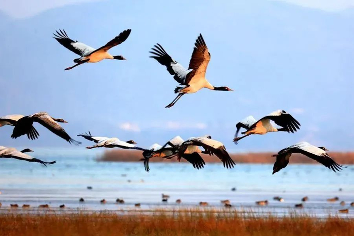 草海是贵州最大的天然淡水湖,以水草繁茂而得名。这里被誉为“全球十佳湖泊观鸟区”之一,越冬的黑颈鹤“携儿带女”,越过千山万水,飞回云贵高原,在食物丰富的草海“度假”。