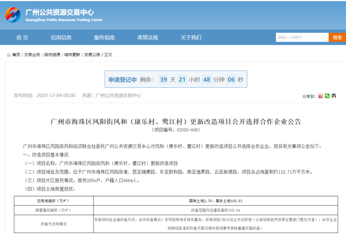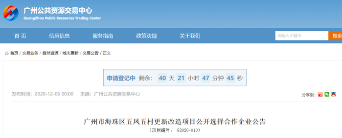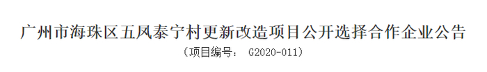 公告指出,为保障海珠区凤阳街五凤沙溪村、五村、泰宁村的整体开发建设,交易申请人必须同时报名参与广州市海珠区凤阳街五凤沙溪村更新改造项目、广州市海珠区凤阳街五凤五村更新改造项目、广州市海珠区凤阳街五凤泰宁村更新改造项目的公开选择合作企业交易活动。上述三个更新改造项目最终确定同一家企业作为合作企业。且项目不接受自然人及企业联合体申请。