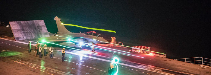 参演“阵风”M战机从“戴高乐”号航母上夜间弹射起飞。