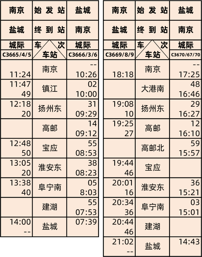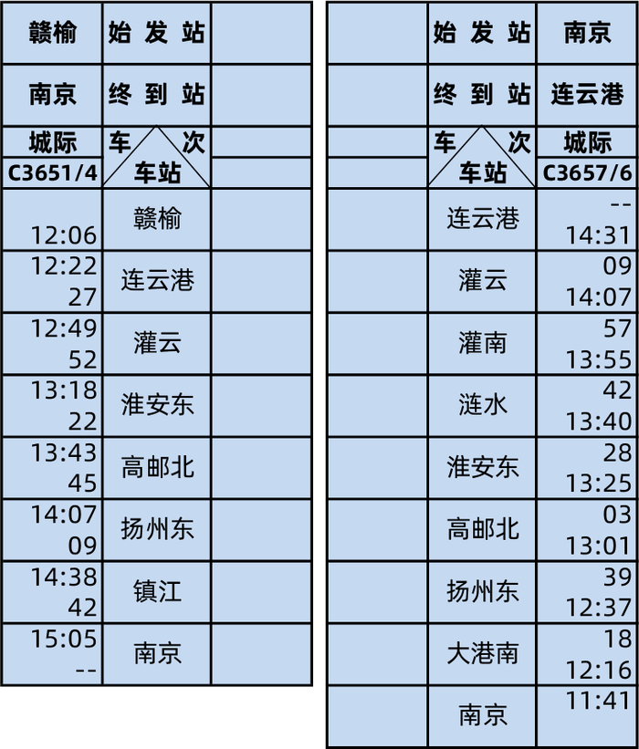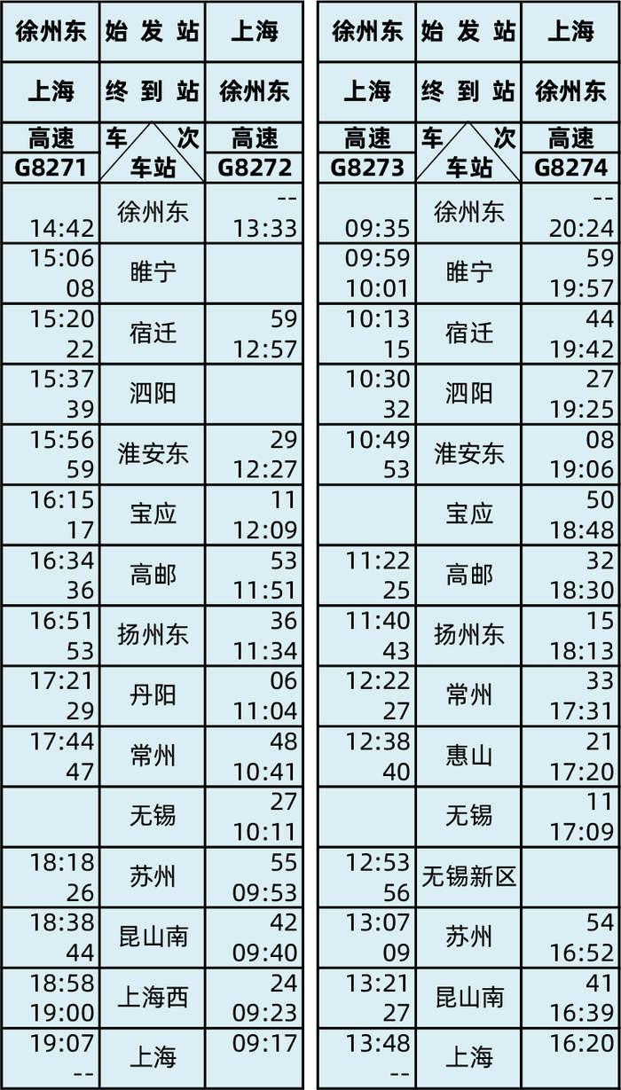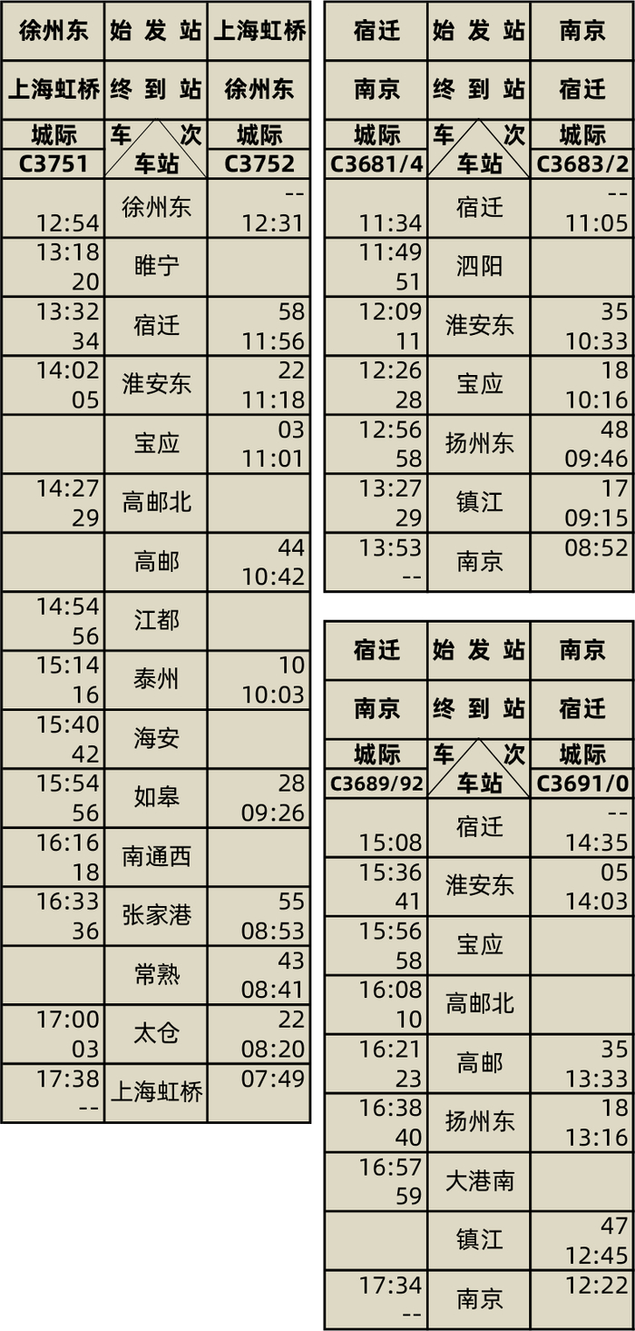 扬州东到上海(虹桥)最快为1小时51分,较现图压缩31分。淮安东到上海(虹桥)最快为2小时40分,较现图压缩2小时35分。连云港至上海最快为3小时30分,较现图压缩4小时49分。