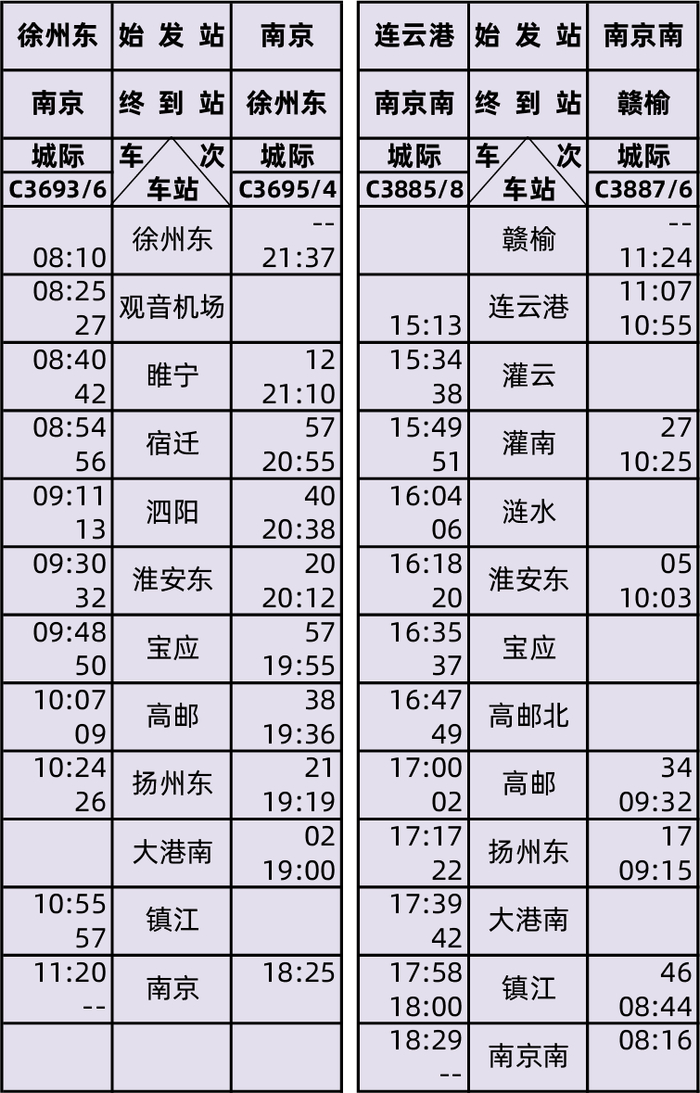 2021年1月20日,全国铁路运行图调整时,将按照日常线、高峰线安排列车开行,列车开行对数大幅增加,计划每日从扬州东、淮安东开行至长三角地区和武汉、北京、广州等方向多趟动车组列车,沿线广大人民群众出行更加方便,江苏多个城市因此受益。