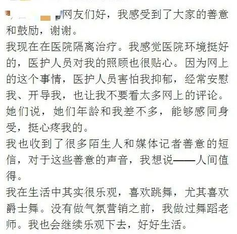 中午12时56分,她再次发文,称自己目前所在的隔离医院环境挺好,医护人员对她的照顾也很贴心,自己也收到了很多善意的声音。