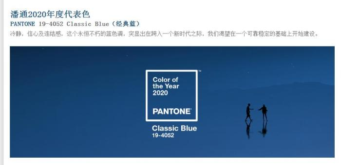 此前,潘通选择的2020年度代表色为PANTONE 19-4052 Classic Blue(经典蓝)。这是一种平静的色彩,为人类心灵带来平和与宁静,提供庇护。它有助于专心与厘清一切,让人们重新集中思绪,也突显出在跨入新时代之际,人们渴望在一个可靠稳定的基础上开始建设。