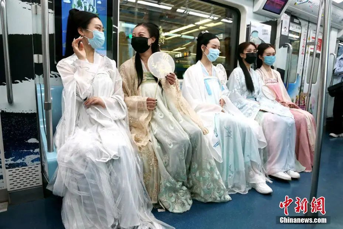 4月30日,西安地铁工作人员身着汉服等待搭乘地铁。