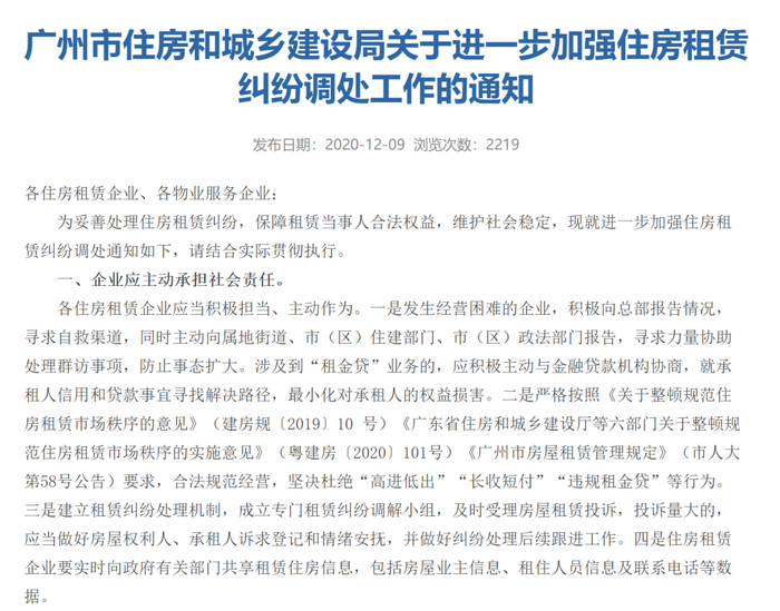 广州市住房和城乡建设局关于进一步加强住房租赁纠纷调处工作的通知