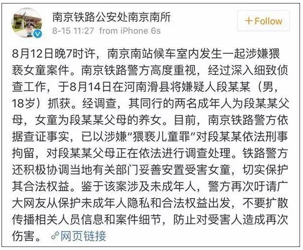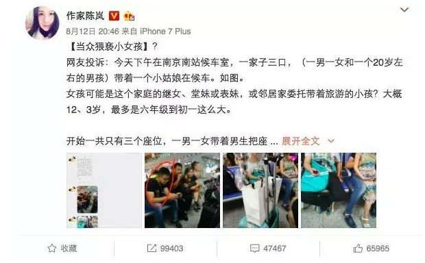2017年8月12日作家陈岚在微博上发布了一则网友投诉,在南京南站候车室一年轻男子竟然当众猥亵一名小女孩,立刻引起了大家的关注。