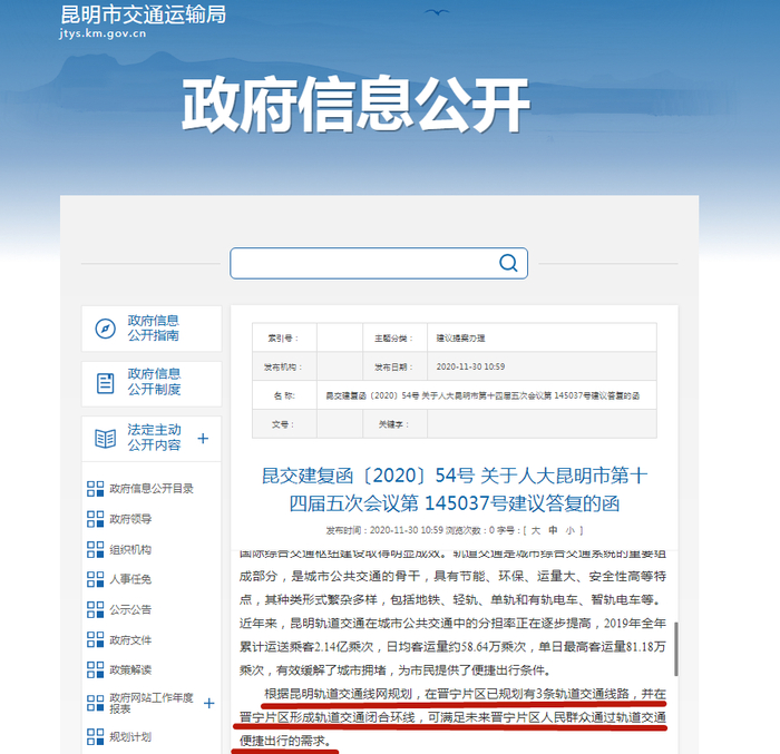 最近,昆明市交通运输局对人大代表提出的《关于尽快启动地铁9号线古滇支线建设并抓紧做好9号线中长期规划的建议》进行了答复: