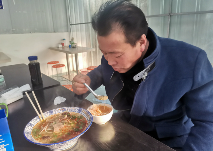 12月7日,是金贵集贸市场的开集日,面馆里食客坐得满满当当,保建明丝毫不乱,安坐在厨房一角,紧盯每一环节,时不时地出声提醒。他像是一位指挥官,在这间小小的面馆里挥斥方遒。