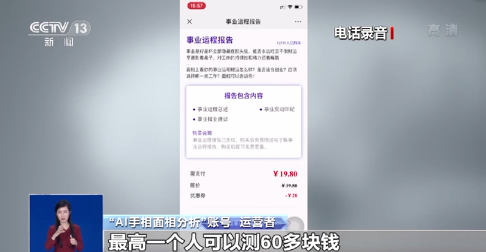 “AI手相面相分析”账号 运营者:面相是9.9元,之后很多人都会测第二次或者第三次,最高一个人可以测60多元。