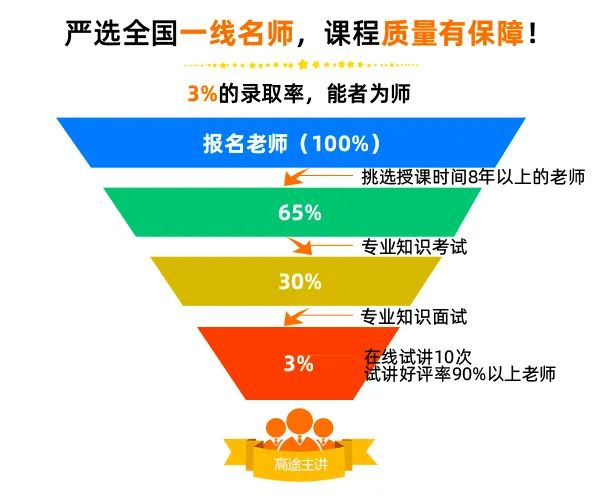 本次课程的每位主讲老师都经过4轮严格筛选,录取率仅有3%,平均教龄10年以上,在线授课时长10000+小时。