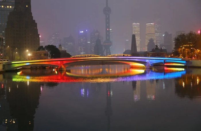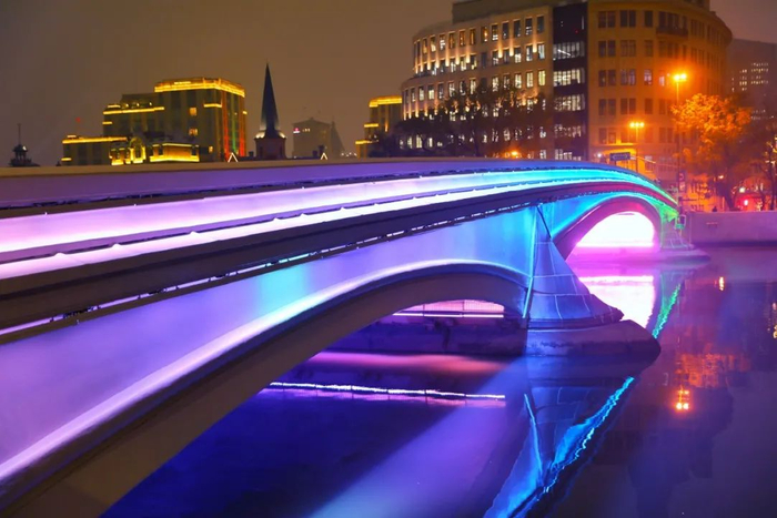 在夜景照明改造上,体现的也是有节制的热烈、有约束的自由,避免过度用光,防止扰民。设计改造团队将桥梁的夜景亮度控制在安静的范围内,避免产生光污染。并且根据周边的使用功能进行调节,在居民区密集区域,照明的方案也更为柔和。同时,考虑到苏州河预留了日后的游船功能,此次桥梁的夜景灯光照明中,还特意在桥墩下装灯,对桥下空间进行了打亮处理。