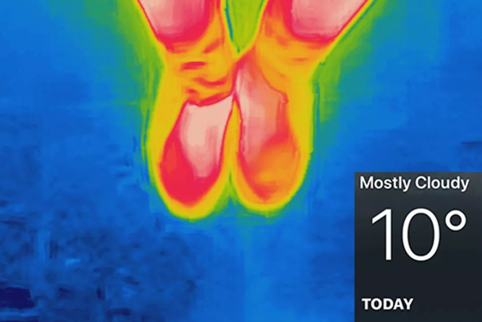 穿了量橙的鞋子已经热到红里发白了。而普通加绒运动鞋只是保存了体表温度表现为红色,但表面温度已经完全蒸发。周围更是微微发绿,脚更是冷到发麻了。