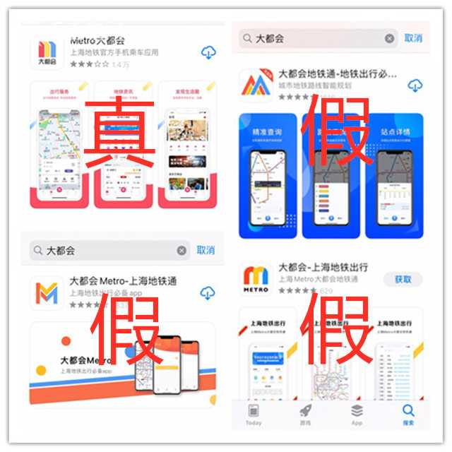 小坊也试着在苹果手机里搜索了一下,输入“大都会”,就跳出来的很多个APP。前三个看上去非常相似,图标都是红黄蓝的配色,都有“地铁”、“大都会”这些关键词,那到底哪个才是正宗的呢?小坊查证发现:这三个全是假的!
