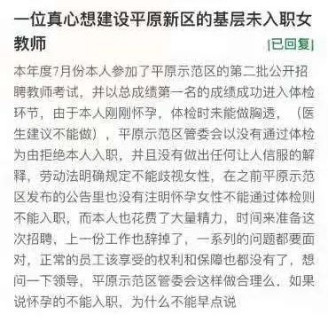 2019年7月,来自河南省新乡市原阳县的许女士,参加了由新乡市平原示范区组织人力资源社会保障局和平原示范区文教体卫局联合组织的第二批中小学幼儿园教师招聘考试。最终,许女士以笔试第二、面试第一的成绩进入到招聘的体检环节,以为能顺利入职的她却没想到在体检环节出了问题。