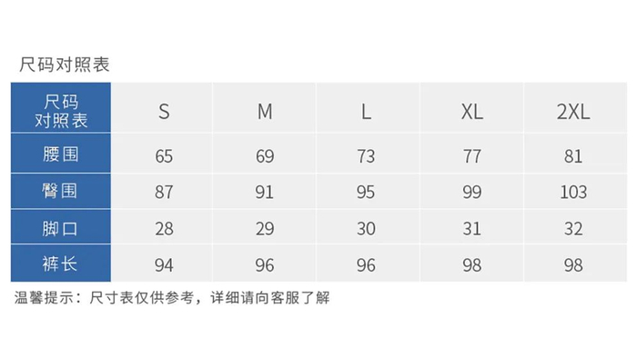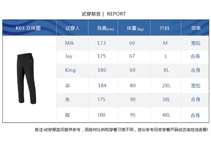 K系抗寒裤(男款)的尺码表如下👇