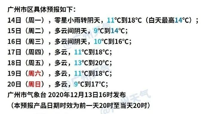 15-16日,西北部、西部偏西市县阴天到多云有小雨或分散小雨,其余大部分市县多云天气为主,早晚寒凉,西北部偏北市县有5℃以下的低温天气,广州最低气温11℃左右。