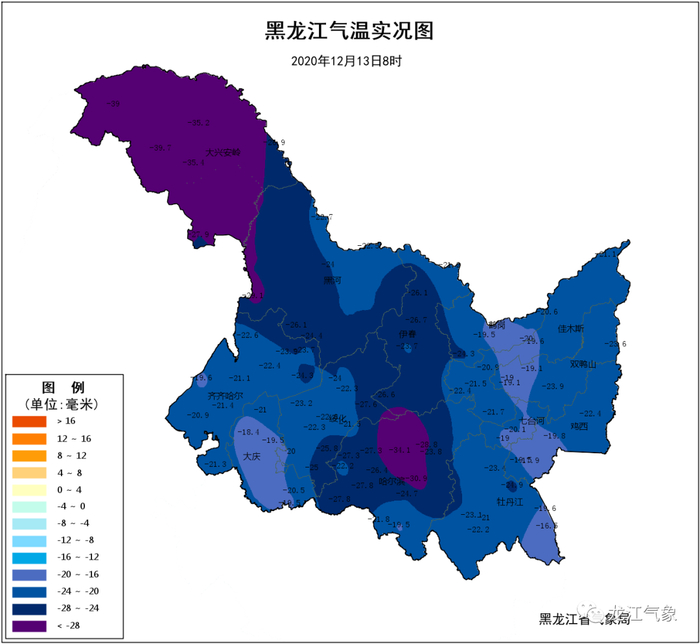 13日夜间最低气温:大兴安岭北部-40~-38℃,大兴安岭南部、伊春-31~-29℃,黑河、鹤岗、绥化、哈尔滨东部-26~-24℃,其它地区-23~-21℃。