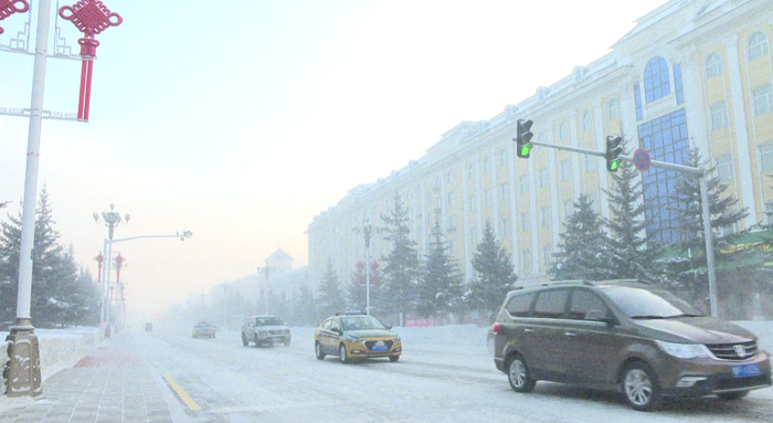 当地人常说的冒白烟,指的是持续低温使得空气中的水汽凝华而出现极端冰雾天气。冰雾下的街道笼罩在一层白雾之中,能见度不足500米,车辆纷纷开启雾灯并减速慢行。漠河独特的极寒气候,每天都吸引络绎不绝的南方游客一路向北,体验泼水成冰,挑战极寒天气。