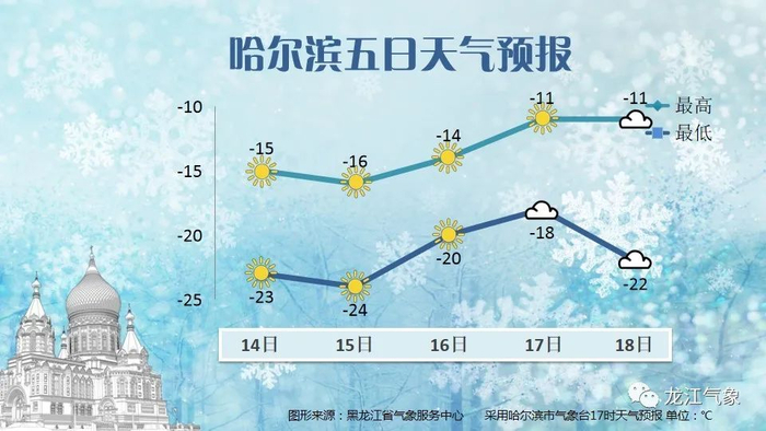 14日白天最高气温:大兴安岭北部-24~-22℃,大兴安岭南部、黑河、伊春-20~-18℃,齐齐哈尔、牡丹江-15~-13℃,其它地区-17~-15℃。