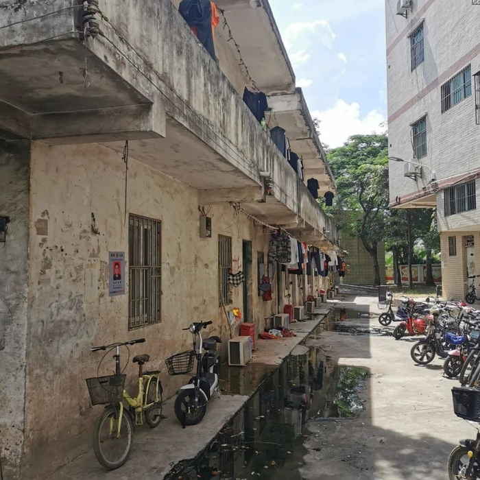 中国建设银行深圳市分行的工作人员,在一次深入城中村几位环卫工人的租房时,发现门口污水横流,水电设施老旧,墙体斑驳发霉,楼上护栏低矮,有些环卫工人的孩子就在走廊上追逐打闹,随时可能从楼上翻下来。