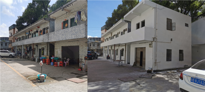 深圳龙岗南约社区“CCB建融家园·劳动者之家”项目先后对比图。左图为改造前的面貌,房体破旧,设施老化,私搭乱盖较多,污水横流。改造后干净整洁,令人身心愉悦。