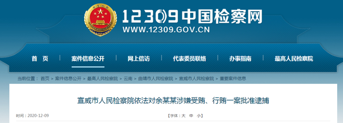 宣威市人民检察院依法以涉嫌受贿罪、行贿罪对余某某作出批准逮捕的决定。案件正在进一步办理中。