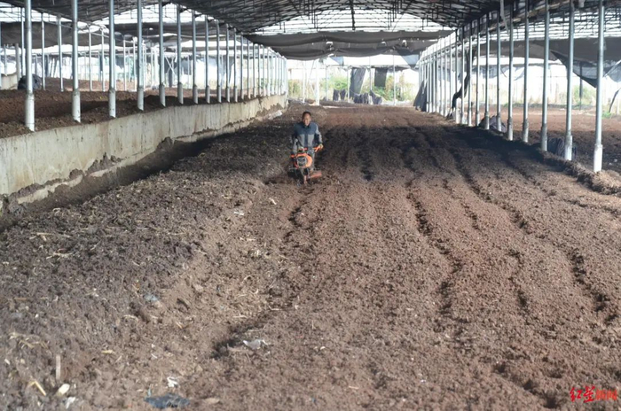 12月13日,在西昌市高草回族乡谌堡村的蚯蚓粪生产基地内,不时传来一阵阵臭味,大棚内的养殖床一垄一垄的,形式大小统一,罗景杨扒开阴暗潮湿的泥土,密密麻麻的红色蚯蚓不断蠕动。