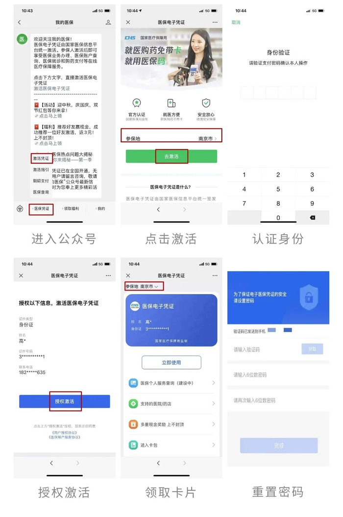 搜索“我的医保”,进入“我的医保”公众号,点击左下角“医保凭证”,点击“激活凭证”,定位所在城市,输入你的微信6位支付密码验证身份,授权激活,点击同意人脸验证,设置医保电子凭证的密码,就完成了。