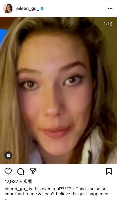 社交媒体截图。谷爱凌宣布自己被斯坦福大学录取。