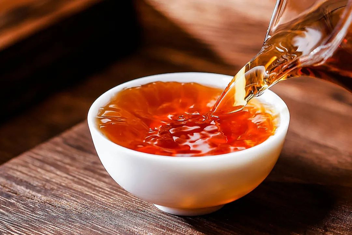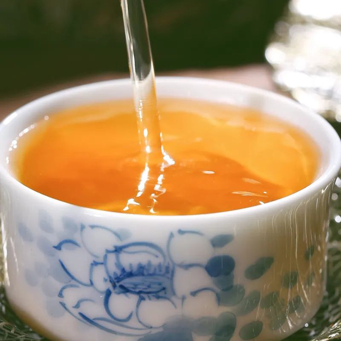 茶汤,汤色金黄,水中带甜,甜中带香,清澈有金圈。