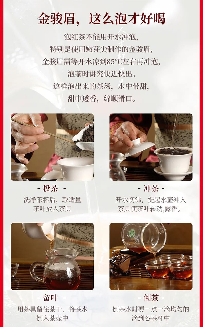 所谓“眉”:传统名茶皆有“眉”名,金骏眉茶型修长如眉,“眉”还有长久、长寿之意。