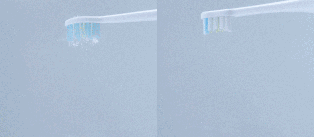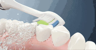 随着纳米声波的高速转动,把牙膏化成无数绵密的小气泡渗入到牙齿缝隙中,再利用水的冲击力将脏污带出来。