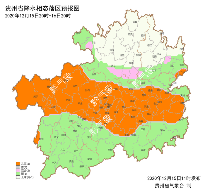 今天夜间到17日白天,毕节市、六盘水市中北部、安顺市北部、贵阳市、黔南州中北部、黔东南州中北部阴天有冻雨,遵义市、铜仁市阴天有零星雨夹雪或小雨,省的中北部地区最低气温维持0℃以下,在地势高处、桥梁、隧道口等地将出现道路结冰,其余地区阴天有小雨。