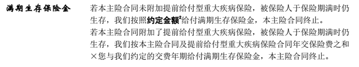 保障期满,保障到60/70/80周岁时,没有出险,福满分20将给付满期生存保险金。此处,若单独购买主险,给付金额为主险约定金额,即100%主险所交保费。如果同时购买了主险和附加提前给付重大疾病保险,给付金额为两者所交保险费之和。综合来看,相当于将全部所交保费以生存金的方式一次性给到我们,可以作为我们养老的有力补充。