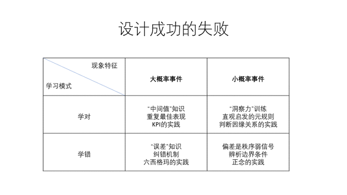 同样依据概率统计原理,大概率事件在正态分布的尾端显现出事物变化的偏差(统计上的标准差),即没有遵守已知规律的部分。它们出现,可能是偶然性因素,可能是人们执行规律的精细程度还不够。总结概率偏差,我们找到降低人的行为表现误差的方法。认识“误差”后,我们设立纠错机制。为提高产品质量,许多企业都贯彻执行“六西格玛”质量控制体系。这个最早来自摩托罗拉生产管理的方法就是用概率分布的标准差(西格玛,Sigma)衡量质量变差。然后,用各种方法,不断降低标准差,提高产品和服务的稳定性。大概率事件学错对标的是已知规律。
