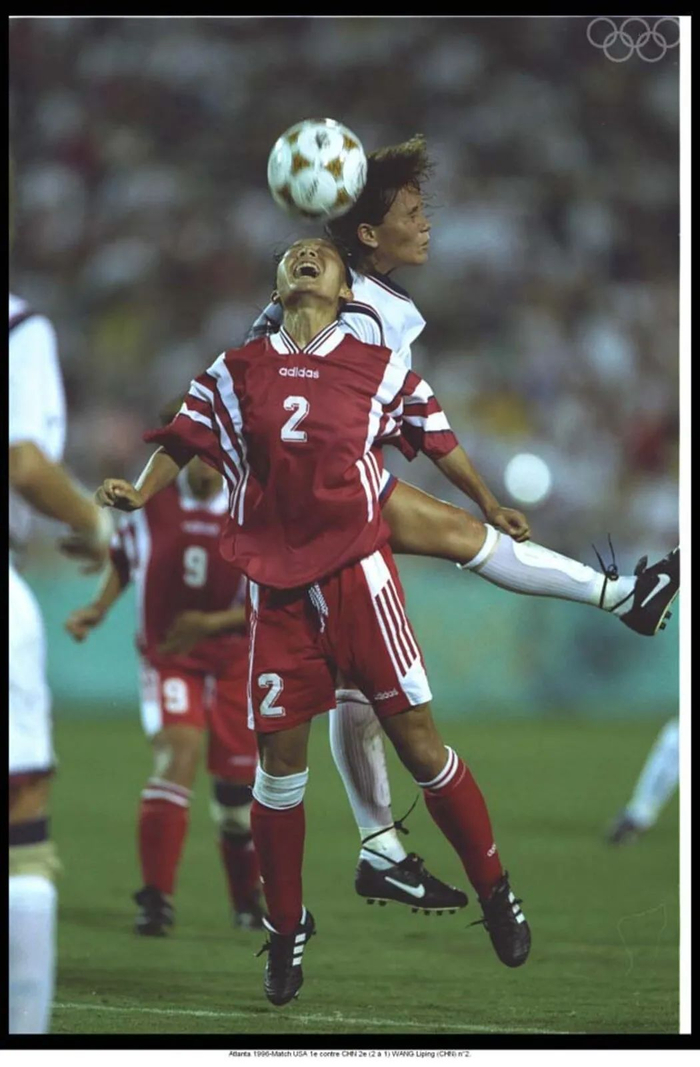 1996年奥运会小组赛,中国队VS美国队,中国球员王丽萍争顶。图片来源:国际奥委会网站。