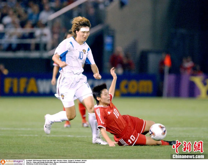 2003世界杯小组赛,中国VS俄罗斯,刘英与俄罗斯球员争球。