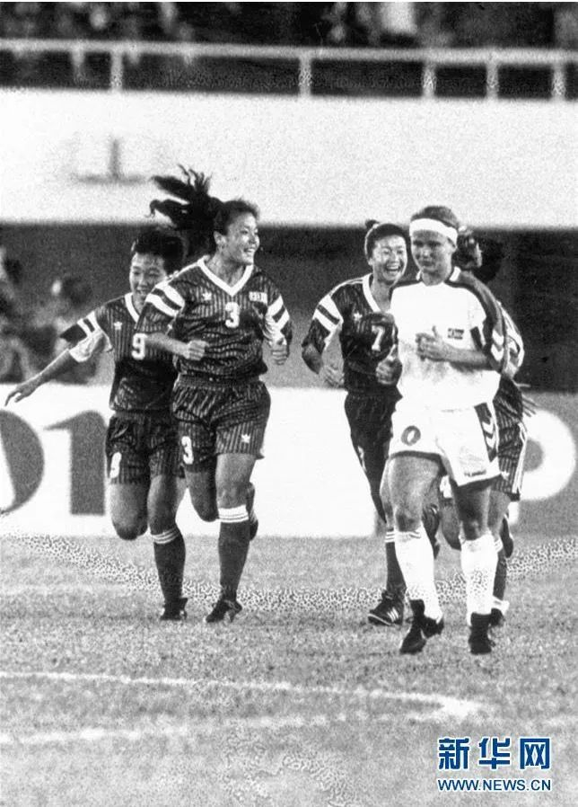1994年,广岛亚运会女子足球决赛,中国队2:0战胜东道主夺冠。新华社发
