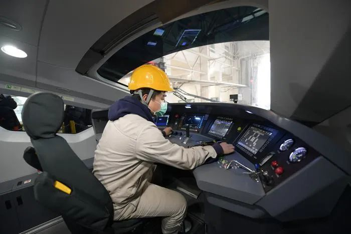 工作人员在列车驾驶室进行作业检查