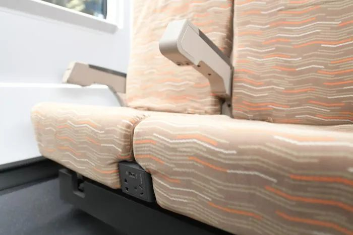 二等3人座椅的两座垫之间设置2个插座,每个插座面板集成1个三孔、1个两孔、1个USB口电源,旅客使用电子设备更加方便。