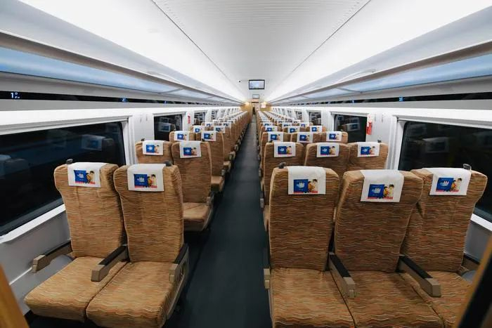 CR300BF型“复兴号”动车组全列采用8辆编组,总定员613人,其中一等座48个席位,二等座565个席位。