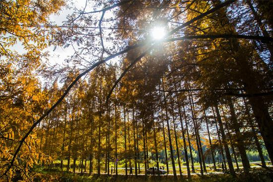 11月19日,游客在福建省三明市将乐县国家级自然保护区水杉大道游览。
