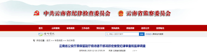 云南省公安厅原保留副厅级待遇干部汤跃宏接受纪律审查和监察调查