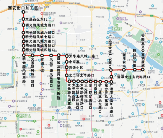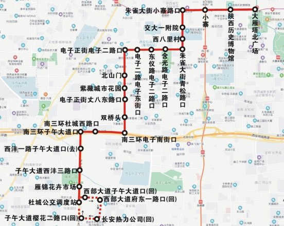 取消站点12个:电子南街公交调度站、双桥头、紫薇城市花园、北山门、电子正街电子二路口、电子二路电子东街口、东仪路电子二路口、含光路电子二路口、朱雀大街青松路口、西八里村、交大一附院、朱雀大街小寨路口。