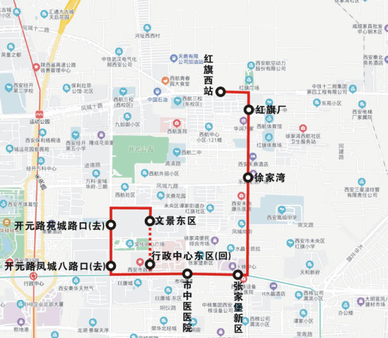 去程由红旗西站发车,经红旗路、渭滨路、凤城八路、开元路、苑城路、永徽路至文景东区;回程由文景东区发车,经永徽路、凤城八路、渭滨路、红旗路至红旗西站,首班06:30, 末班20:30,线路长度4公里,实行无人售票空调车投币两元可刷卡票制。